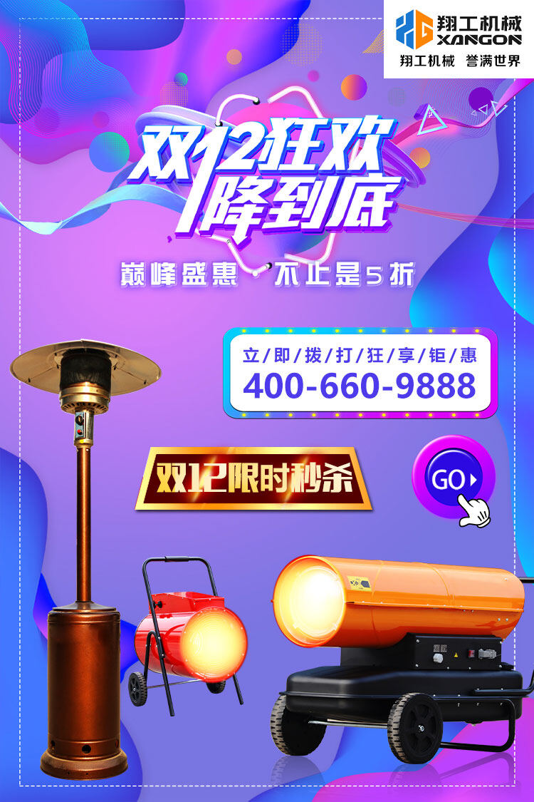 雙12值得買的就是它 便宜,便宜,再便宜惠; 就是這么簡單、粗暴 為回饋新老客戶一直以來的厚愛與支持, 雙12鉅惠開始啦 凡在此期間購買翔工機(jī)械的取暖設(shè)備都可享受便宜的價位 實惠多多,不容錯過