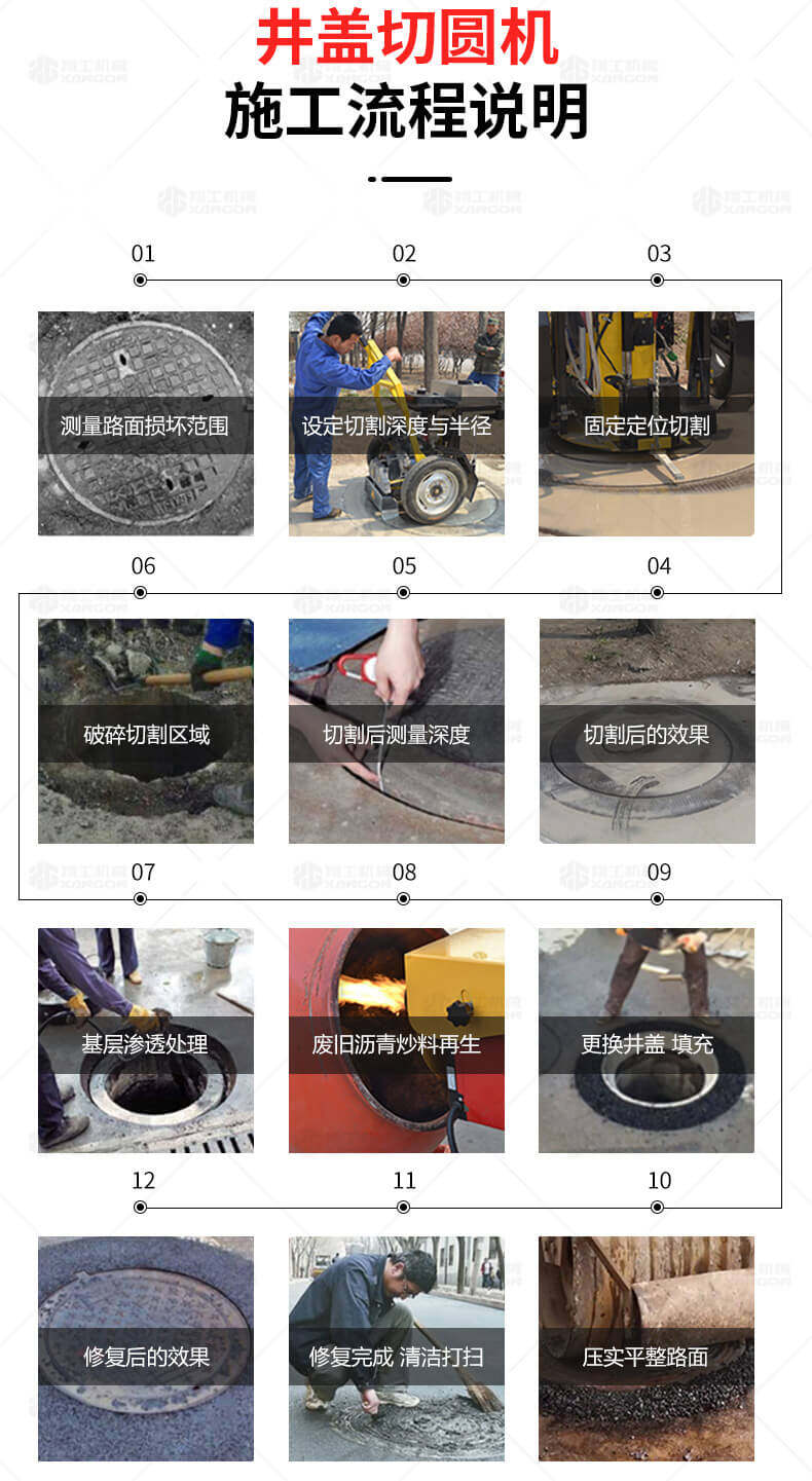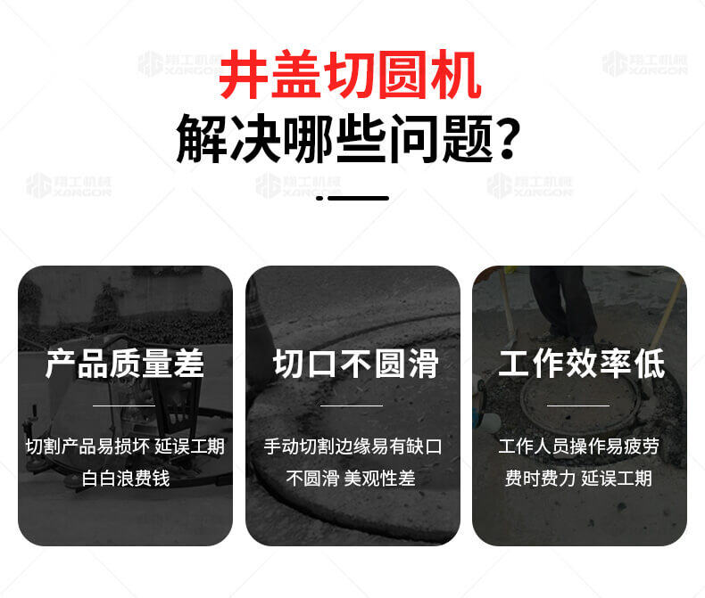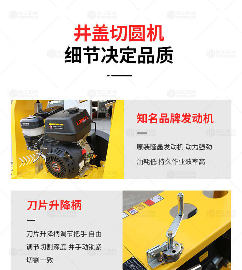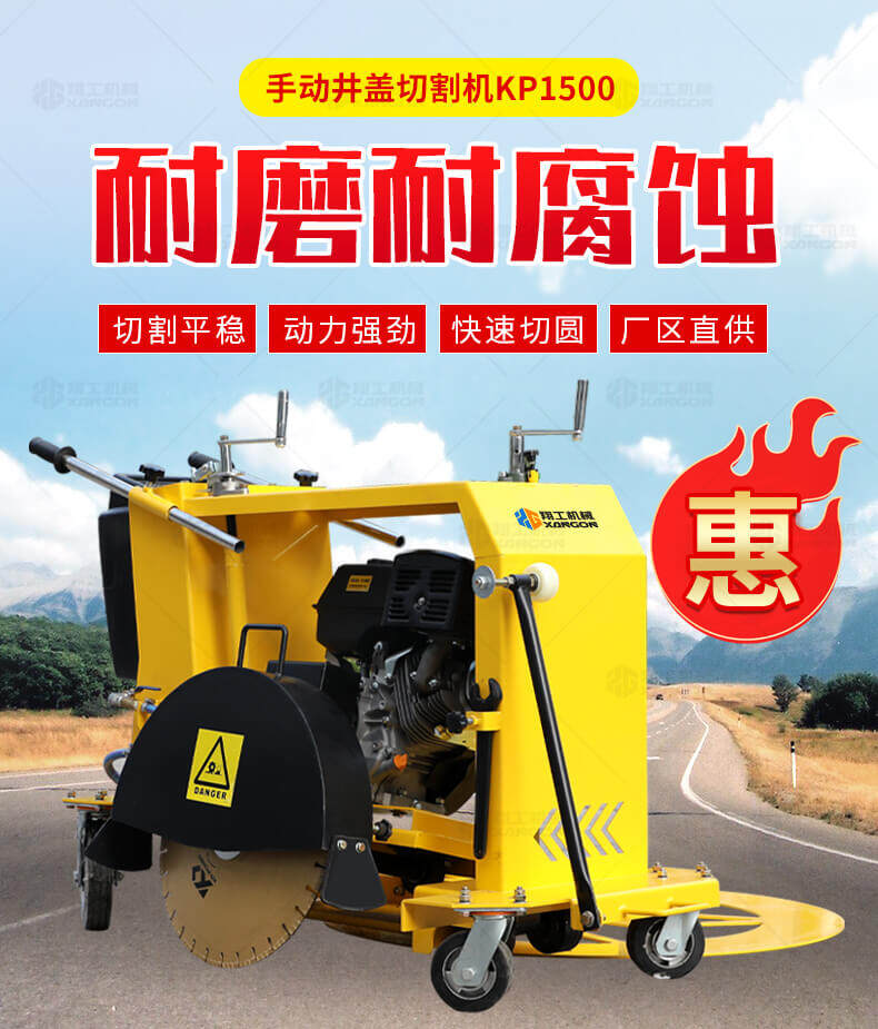 XG-1500型井蓋切割機,專門用于對城市道路中機動車道等井蓋周圍的水泥混凝土或瀝青路面進(jìn)行圓形切割。為清楚井蓋周圍的破損路面提供分割區(qū)域,恢復(fù)后的地面美觀,延長了路面的使用壽命。