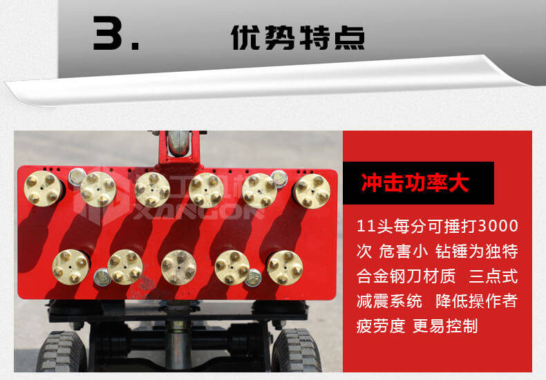 1、11個(gè)鑿毛頭的沖擊功率大,可達(dá)2200blow/分鐘,危害小;