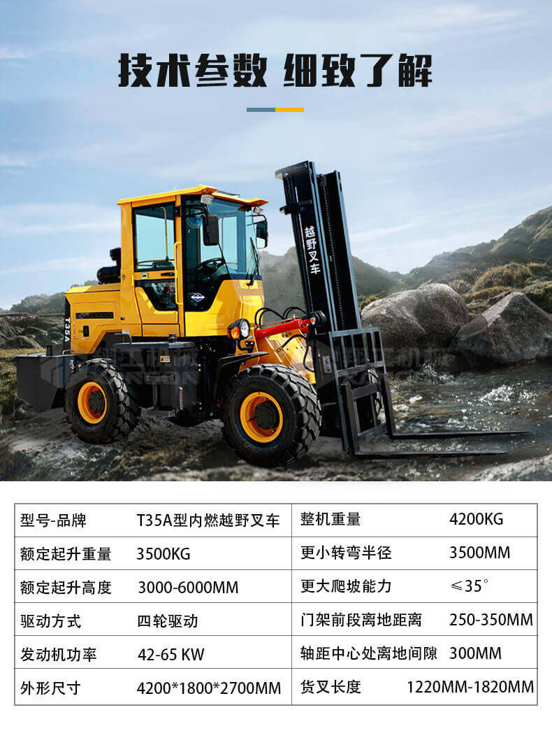 4.越野叉車的速度高于普通叉車,目前已發(fā)展到40km/h,其機(jī)動(dòng)性顯而易見(jiàn)。