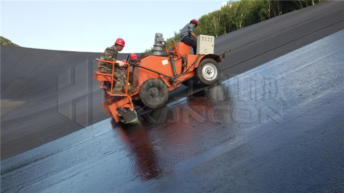 瀝青封閉層的施工采用適合于斜坡施工的專用瀝青瑪蹄脂涂刷機,在牽引臺車的牽引下沿著面板從下往上涂刷。涂刷完一個條帶后,將涂刷機移動至下一個條帶繼續(xù)涂刷。瑪蹄脂封閉層涂刷作業(yè)時環(huán)境氣溫應(yīng)在10℃以上,涂刷溫度一般在170℃~190℃;施工完成的封閉層表面禁止無關(guān)人員和機械行走;特殊部位:壩頂及曲率半徑較小的圓弧斷,采用小型機械涂刷方式進行機械涂刷進行,環(huán)庫水平段及弧段全部采用小刮涂機配合人工進行刮涂施工。