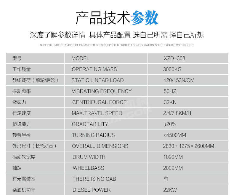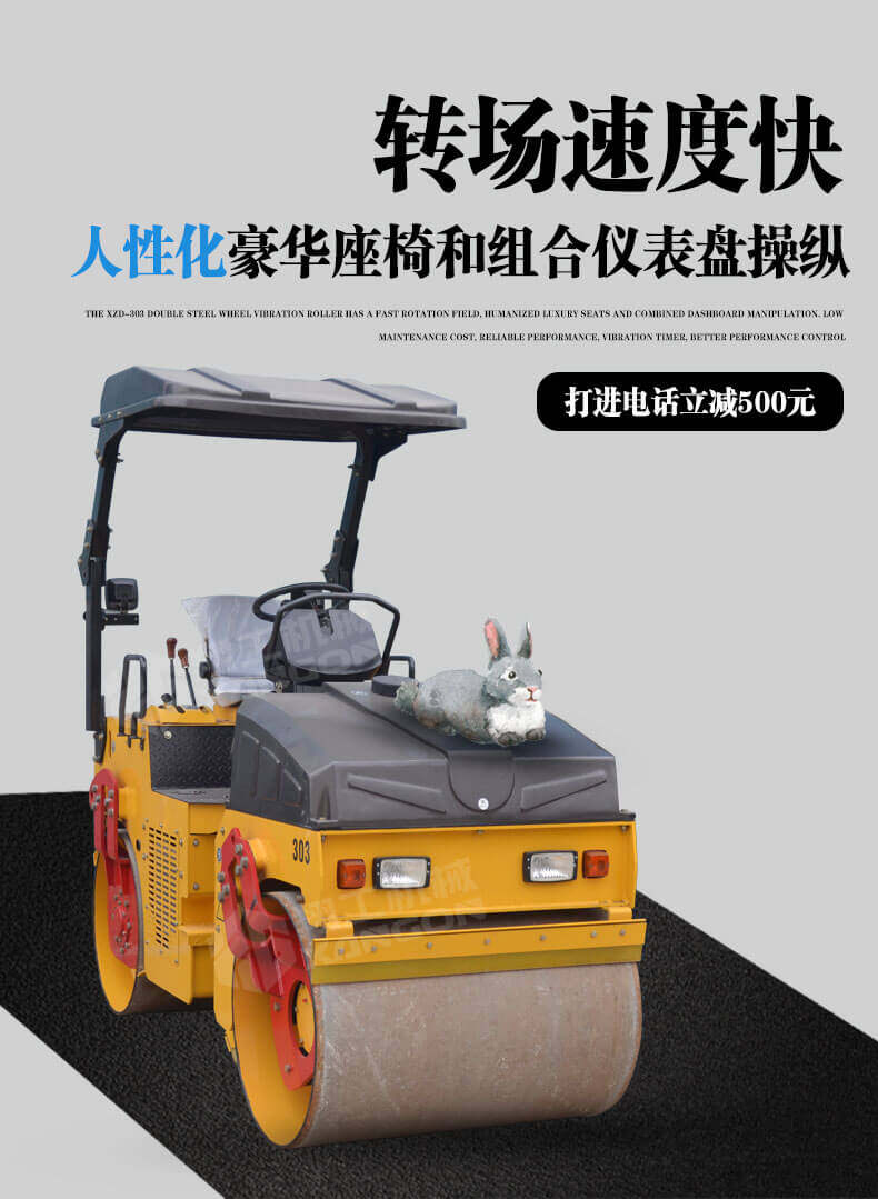 1,XZD-303雙鋼輪振動壓路機轉(zhuǎn)場速度快,人性化豪華座椅和組合儀表盤操縱。維修成本低,性能可靠,配置震動計時器,對工作績效更好地控制;