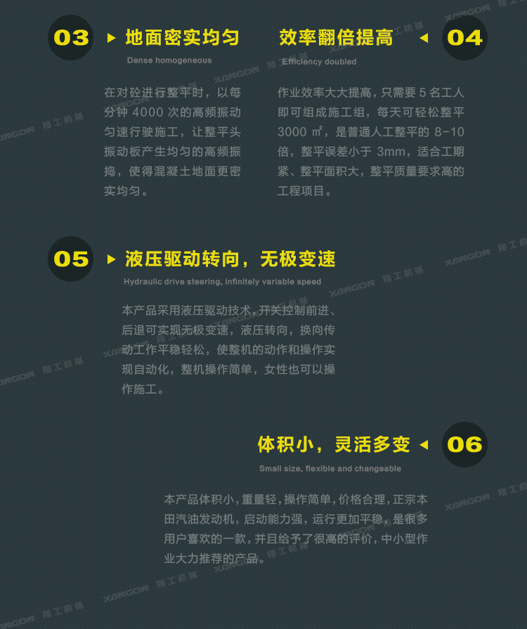 3,本產(chǎn)品能一次性鋪設(shè)混凝土基層,將其抹平將其震蕩光滑,您的工作速度將大大提高,因為該機器自動設(shè)定標(biāo)高,使得操作員快速的通過工作區(qū)域;